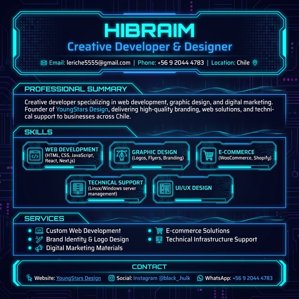 En YoungStars Design, nos especializamos en crear identidades visuales impactantes y plataformas web de alto rendimiento. Desde el diseño de flyers y logotipos hasta el mantenimiento técnico de tu negocio, nos encargamos de todo para que tú solo te preocupes por vender.